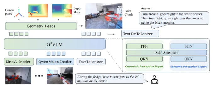 G²VLM 将这个原理用在了 AI 模型上,它不是一个单一的“大脑”,而是由两位专家紧密合作构成的: