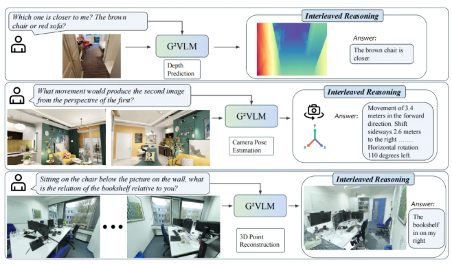 最关键的是,这两位专家并不是各自为战,而是通过一个共享的注意力机制来进行紧密相连,以便能够随时交流信息。当语义专家说“这里有个沙发”时,几何专家就会立马补充说:“这个沙发距离墙壁大约有 1.5 米,高度是 0.8 米。”这种实时的、深度的协作,让 G²VLM 同时具备了看懂内容和理解空间的超能力。