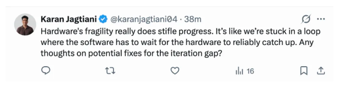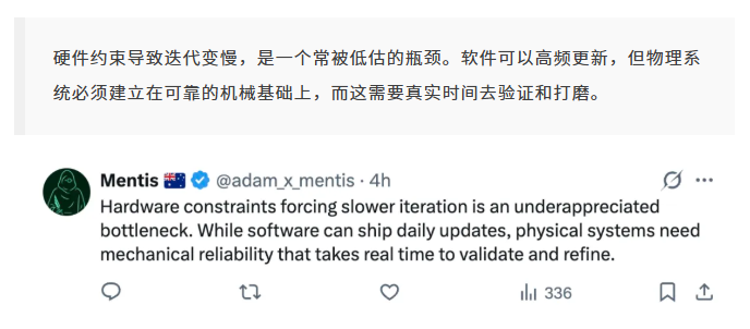 硬件约束导致迭代变慢,是一个常被低估的瓶颈。软件可以高频更新,但物理系统必须建立在可靠的机械基础上,而这需要真实时间去验证和打磨。