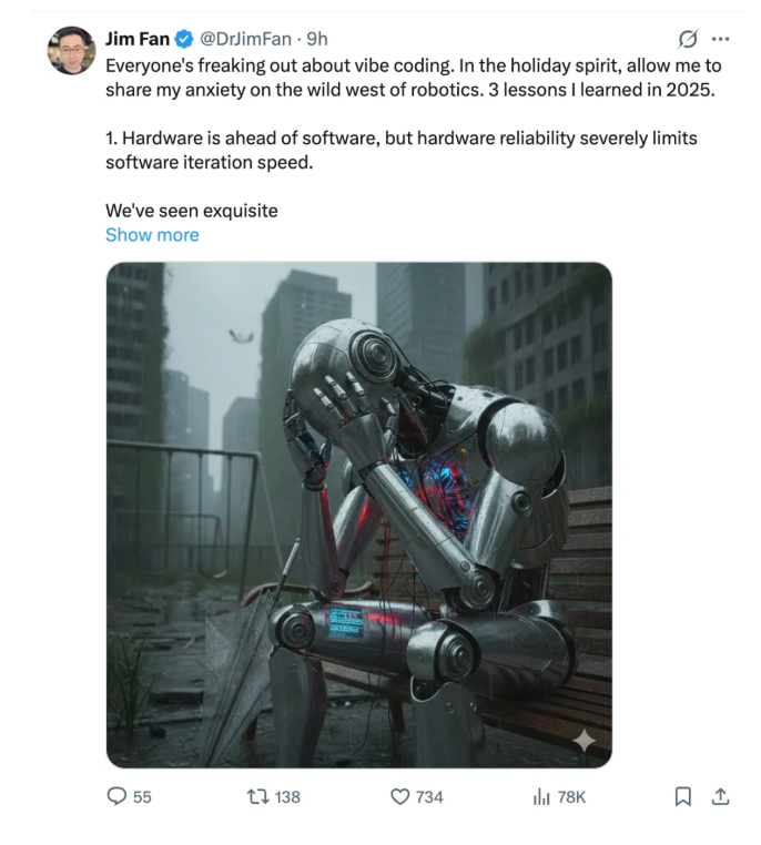 所有人都在为vibe coding感到兴奋。在节日气氛中,请允许我分享一下我对“机器人领域狂野西部”的焦虑——这是我在2025年学到的3个教训。