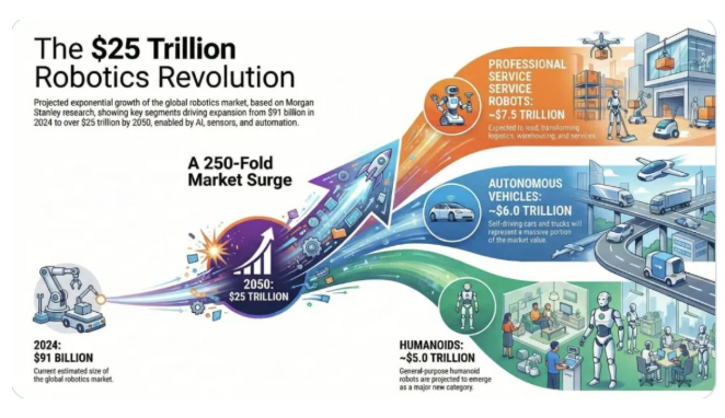 据摩根士丹利的研究,机器人产业有望从当前的910亿美元激增至2050年的25万亿美元。
