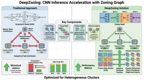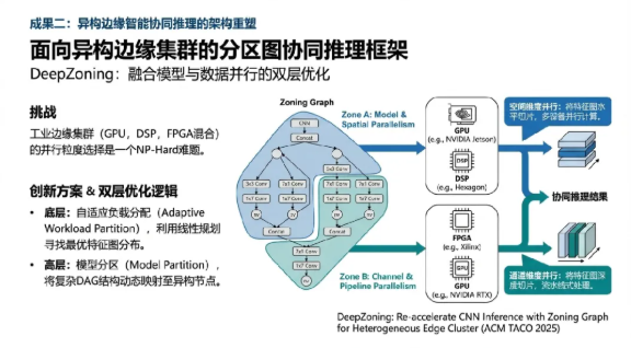 工业边缘集群通常由不同代际的GPU、DSP及FPGA组成,如何在这类高度异构的环境中寻找最优的并行粒度是一个NP-Hard难题。团队提出的DeepZoning框架(DeepZoning: Re-accelerate CNN Inference with Zoning Graph for Heterogeneous Edge Cluster, ACM TACO 2025)通过引入“分区图”(Zoning Graph)概念,完美融合了模型并行与数据并行的优势。