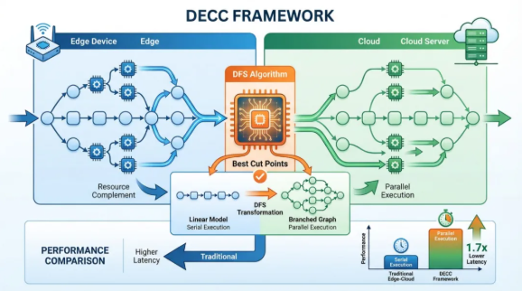 在网络带宽剧烈波动的工业互联环境下,静态的模型切分方案往往导致严重的延迟波动。团队设计的DECC算法(DECC: Delay-Aware Edge-Cloud Collaboration for Accelerating DNN Inference, IEEE TSC 2025)引入了动态分区决策机制。通过在线测量iperf带宽并结合轻量级性能估算模型,DECC能够将DNN划分为多个独立分支,并在端侧与云侧建立“近乎无气泡”的流水线。