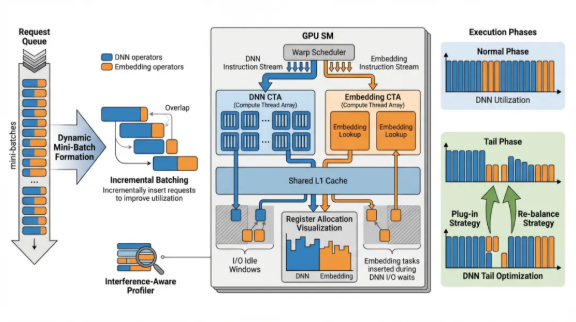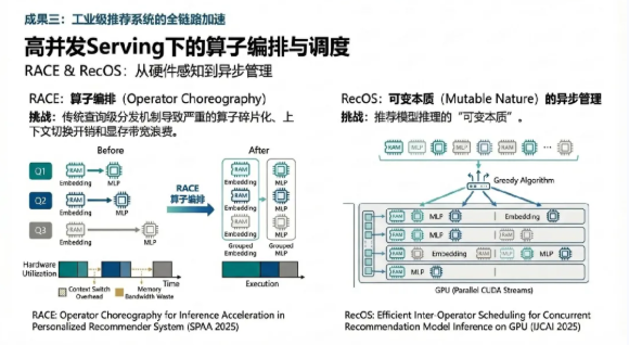 在Web级推荐系统中,GPU需要同时处理成百上千个并发查询。传统的查询级算子分发机制会导致严重的算子碎片化与显存带宽浪费。团队研发了RACE框架(RACE: Operator Choreography for Inference Acceleration in Personalized Recommender System, SPAA 2025)。该框架通过“算子编排”技术,将Embedding查找与MLP计算等不同性质的任务进行交叉调度与重组。