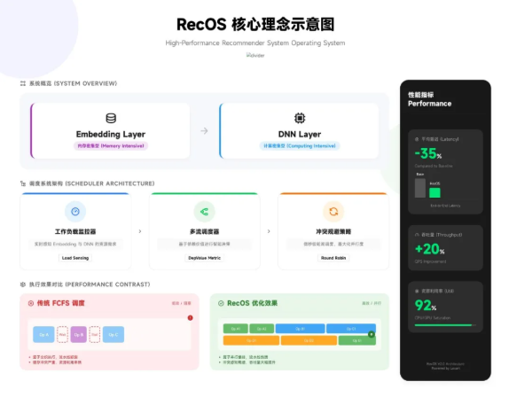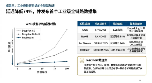最后,我们把目光投向了AI应用中结构最复杂、优化难度最高的领域之一——推荐系统,这里的挑战要求我们超越传统的并行化思维。推荐系统作为互联网工业的流量引擎,其推理性能直接关系到企业的商业变现能力。团队针对推荐模型(RM)有的Embedding查找开销及高并发查询下的GPU竞争问题,从算子编排与全流建模角度实现了深层次优化。