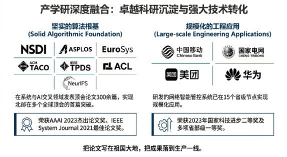 北京邮电大学网络智能研究中心NIRC团队始终坚持“把论文写在祖国大地、把成果落到生产一线”。团队产学研积累深厚,在ACM TACO、IEEE TPDS、IEEE ToN、JSAC等顶级期刊以及USENIX NSDI、ACM ASPLOS、EuroSys、INFOCOM、NeurIPS、ACL等顶级会议发表高水平论文300余篇。特别是在系统架构与人工智能交叉领域,实现了北邮在NSDI、ASPLOS、SIGMOD、EuroSys、CSCW等全球顶会上的首篇突破,荣获AAAI 2023杰出论文奖及IEEE System Journal 2021最佳论文奖,这种卓越的学术表现为工业化加速方案提供了坚实的算法根基。所研发的网络智能管控系统已在中国移动、国家电网、美团、华为等单位的15个省级节点实现规模化工程应用,荣获2023年国家科技进步二等奖和多项省部级一等奖。