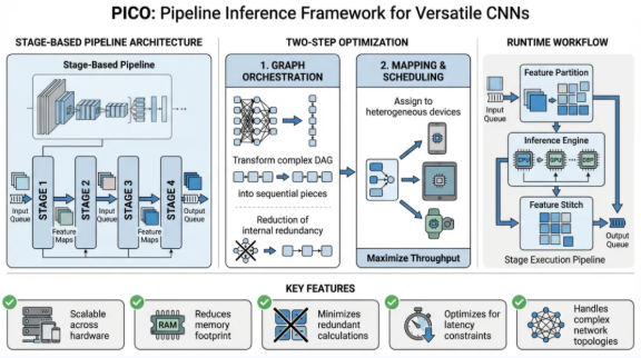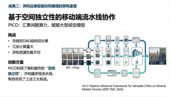 针对移动设备(如树莓派、手持终端)集群,团队研发了PICO框架(PICO: Pipeline Inference Framework for Versatile CNNs on Diverse Mobile Devices, IEEE TPDS 2024)。PICO敏锐地捕捉到了卷积操作的“空间独立性”,将输入特征图切分为多个Tiling,并在异构节点间构建多级流水线。