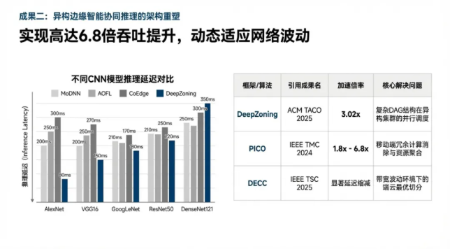PICO攻克了非线性DAG结构切分难、冗余计算量大、异构资源负载不均三大挑战。在由8台树莓派组成的真实测试床中,PICO在不同频率环境下实现了1.8至6.8倍的吞吐量提升 10。该技术的价值在于,它能够将闲散的边缘算力汇聚成虚拟的高性能计算池,在保障隐私(数据不出本地)的同时,赋予了普通终端运行大型视觉模型的能力。