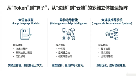 从ClusterAttn中揭示LLM注意力的内在结构,到通过DECC和RACE等技术编排复杂的图计算,我们的工作证明了真正的AI加速来自于在各个层面深度理解并重构系统。AI推理加速是一个复杂的系统工程,需要根据模型结构、硬件环境和应用场景进行“量体裁衣”式的优化。我们团队通过对大语言模型、卷积神经网络以及推荐系统的全方位推理加速研究,构建了从“Token”到“算子”,从“边缘”到“云端”的多维立体加速矩阵。