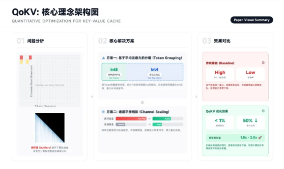 量化是降低LLM显存占用的事实标准,但量化带来的精度损失常导致工业级应用失效。团队在QoKV(QoKV: Comprehending and Surpassing the Hurdles of KV Cache Quantization, ICASSP 2025)中,深入探讨了KV缓存量化的核心瓶颈。通过对量化误差分布的精细化建模,团队提出了一套能够自适应调整量化比特位的策略,确保在极低位宽(如4-bit或更低)下,模型的逻辑推理与语义生成能力依然稳健。