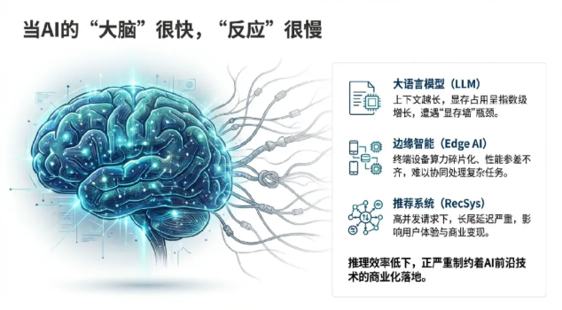 回望2025年人工智能产业全面爆发,中国MaaS(模型即服务)市场规模实现了4至5倍的增长,行业预判2026年增速有望达到10倍。在这一背景下,AI技术重心正从模型训练向大规模推理端(Inference)迁移。然而,工业界在推进AI落地时面临着严峻的挑战:大语言模型(LLM)的显存墙瓶颈、边缘设备算力的碎片化、以及推荐系统在高并发下的长尾延迟。