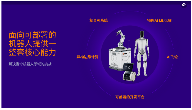 其中,复合AI系统作为融合视觉、语言及传感器输入的智能体框架,涵盖推理模型、视觉语言动作模型、感知、运动控制等核心组件,使机器人实现感知、交互、推理与行动;物理AI机器学习运维通过行为克隆、强化学习及数字孪生等技术训练优化模型,支持技能从虚拟环境迁移到真实世界;AI数据飞轮提供数据采集、整理与标注系统,赋予机器人持续学习能力,是规模化部署的关键基础设施;可部署开发平台提供模型库、SDK及示例应用,支持客户快速构建产品;异构边缘计算通过软硬件协同设计与创新内存架构,为机器人提供强大的边缘算力。
