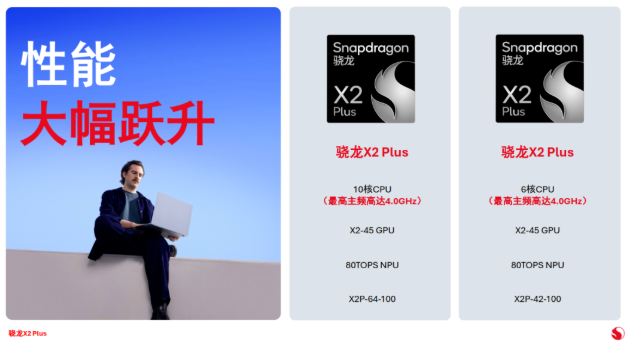 在PC领域,高通推出了全新的骁龙X2 Plus平台,搭载第三代Qualcomm Oryon CPU,配备新一代Adreno GPU,并集成AI性能高达80 TOPS的高通Hexagon NPU,这是目前在同级别笔记本电脑中速度最快的NPU。