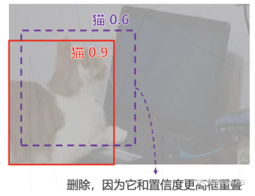 非极大值抑制(Non-Maximum Suppression):实际预测过程中,针对同一个检测目标,可能会存在多个检测框,而我们的预测结果仅保留置信度最高的一个即可,这个算法就是非极大值抑制。(如图,通过NMS把紫色的框丢掉)