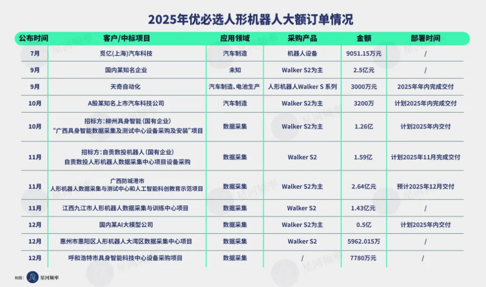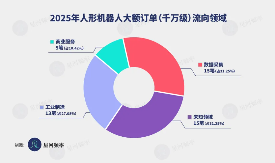 2026 年开年,人形机器人赛道最热闹的看点,集中在「出货量」之争。先是智元机器人全年出货 5168 台,被权威市场研究机构 Omdia 评为 2025 年全球人形机器人出货量第一。后是宇树科技官宣其 2025 年出货量超过 5500 台、量产下线超过 6000 台,将「第一」的宝座拿回自己手中。量产竞争的背后,是 2025 年订单端需求的持续升温。在公开披露信息基础上,结合部分企业的补充确认,我们统计发现,2025 年人形机器人领域订单数量已达 51 笔,其中 48 笔为大额订单(金额达千万元级及以上),订单总金额超过 57 亿元。资本市场的热度也同步抬升。IT 桔子数据显示,2025 年具身智能领域共发生 370 起融资事件,融资总额达到 419.29 亿元人民币。订单、量产、资本在同一年集中爆发,使 2025 年成为人形机器人商业化进程中的一个关键拐点。我们以 48 笔大额订单为主要样本,从订单结构和交付进展入手,尝试还原过去一年人形机器人商业化的真实走向,及其背后的内在逻辑。2025 年,人形机器人领域的大额订单呈现出活跃且多元的格局,集中在下半年爆发。全年共有 16 家公司对外公开了订单进展,其中 14 家公司拥有千万元级大额订单。根据已披露的订单总金额,优必选、智元与银河通用位列前三。需要说明的是,上述统计仅基于息或公司提供资料。实际上,未披露的「水下订单」规模会更为庞大。例如,众擎机器人去年仅公开披露 1 笔大额订单,但其联合创始人姚艾文透露,公司在 2025 年实际获得的千万元级订单已超过 10 笔,人形机器人订单总量也已突破 3000 台。宇树科技虽在公开的大额订单数量上不占优,但其全年出货量超过 5500 台,表明其实际获得的订单总量同样可观,只是订单需求更为分散。综合订单规模和出货量,宇树科技、优必选、智元机器人、银河通用,四家企业共同构成了 2025 年人形机器人订单规模的第一梯队。从订单构成看,几家头部企业呈现出截然不同的商业侧重,分化为两类订单模式:「大额集中型」与「高频分散型」。优必选、智元机器人、银河通用三家为「大额集中型」。他们的大额订单均来源于 B 端产业端,与 G 端的政府/地方国企端。优必选的大额订单主要来自汽车产业客户以及政府和地方国企。其中,汽车领域客户包括东风柳汽、觅亿(上海)汽车科技、天奇自动化等;政府端订单则集中于柳州、自贡、广西、江西等地,主要承接地方数据采集中心和示范项目的建设需求。智元机器人的订单特征则带有鲜明的「华为色彩」,主要集中在华为产业链企业+地方政府项目。智元机器人的客户中,均普智能、富临精工、中国移动、龙旗科技、均胜电子等多家公司均华为合作伙伴;政府侧订单同样以数据采集中心项目为主,落地于珠海、绍兴等地。智元的七位合伙人中,有四位曾任职于华为,包括创始人兼 CEO 邓泰华(前华为副总裁)、CTO 彭志辉(前「华为天才少年」)、营销副总裁姜青松及首席人力资源官钮嘉。深厚的华为基因使其更容易切入以产业和政务为主的大额项目。银河通用的路径与前两者类似。2025 年,其两笔大额订单分别来自汽车零部件企业百达精工,以及台州湾具身智能机器人概念验证中心项目,均指向产业端和政府主导的系统性需求。宇树科技的订单模型是「高频分散型」。天眼查数据显示,宇树科技 2025 年共计中标 62 个项目(含四足机器人),远超智元(23 个)与银河通用(10 个),订单金额覆盖数万至数百万元区间。此外,宇树科技在 C 端与海外的高校、研究机构、产业端也拥有不少订单。总体来看,优必选、智元机器人和银河通用的大额订单普遍呈现出金额高、周期长、客户集中的特征,订单主要集中在产业端和政府端。相比之下,宇树科技的订单模型则更偏向小额、高频和分散。宇树科技的人形机器人定价相对较低,不强调「大脑能力」,也不提供深度定制方案,更适配高校教学、科研实验、小规模巡检等预算分散、采购频次高的场景。这一定位也决定了宇树科技目前难以覆盖对稳定性和系统能力要求更高的产业级应用场景。科研类需求以教学、实验和探索性应用为主,单笔订单规模有限,但总体需求广泛且持续。这类客户更关注价格透明度、交付效率和产品通用性,而非系统级集成能力。在成本结构上,宇树科技单台机器人毛利稳定。分散订单虽然单笔金额不高,但回款节奏快,可以在每一台产品上实现现金流闭环,而不依赖于大型项目来摊薄成本。与之相对,优必选、智元机器人和银河通用以定制化、系统化的解决方案为核心,更贴近产业端和大型政务场景的复杂需求。在这一模式下,人形机器人需要更高的智能上限和系统集成能力,单机价格普遍在 50 万元以上,研发和交付成本更高,通常需要通过数百台起订的千万至亿元级订单,来覆盖前期投入,并配套长期运维服务。从订单面向的行业分布看,数据采集与工业领域是人形机器人需求最集中的方向。这反映出,2025 年的人形机器人市场仍处在「能力建设 + 场景验证」的过渡期。人形机器人企业最稳定的「买单方」是 G 端。15 笔数据采集订单,本质上是政府和国企在为行业提供早期生存空间。不过,具身智能对真实场景、高质量数据的依赖极高,数采类项目其实也是在为行业搭建数据基础设施,同时为相关企业提供持续运转与迭代的资金支撑。另有 13 笔订单流向工业领域,其中 8 笔来自汽车制造