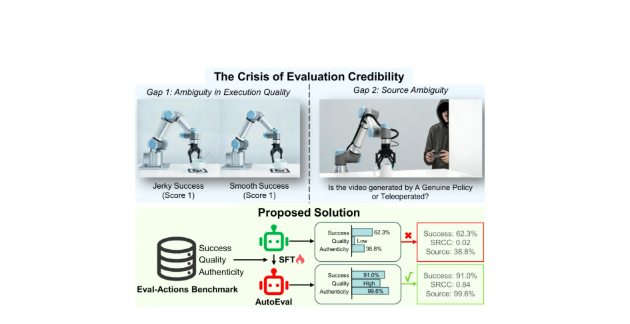 图 1 (上) 评估危机:现有二元指标掩盖了执行质量(如「抖动成功」与「平滑成功」的区别)和来源真实性(难以区分策略生成与人类遥操作)的模糊性。 (下) 解决方案:Eval-Actions 基准与 AutoEval 架构(绿色部分)相结合,填补了这两大空白,实现了精准的细粒度质量评估与鲁棒的来源验证,显著优于传统的通用 VLM(红色部分)。