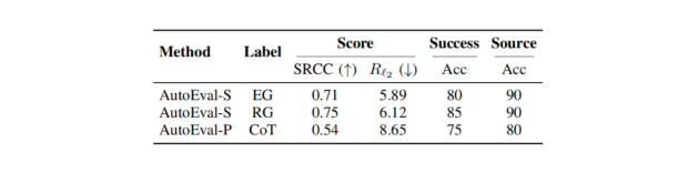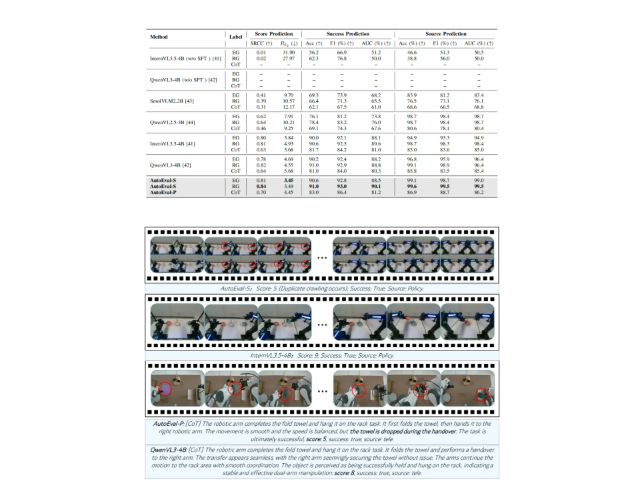 表格 2 Eval-Actions 基准上的性能对比 在专家评分(EG)、排序引导(RG)及思维链(CoT)三种协议下,AutoEval 均取得了 SOTA 性能。特别是在 RG 协议下,AutoEval-S 的评分相关性(SRCC)达到 0.84,来源预测准确率高达 99.6%,远超未微调的 InternVL 和 QwenVL 等基线模型。