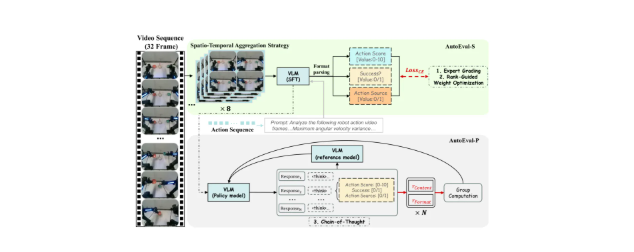 当需要模型输出思维链(CoT)进行解释时,传统模型常出现「幻觉」,即推理逻辑与打分不一致(例如嘴上说「动作完美」,实际上物体已经掉了)。AutoEval-P(Plus)引入了组相对策略优化(GRPO)范式。