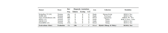 为了打破现有数据集仅关注「成功演示」的局限,研究团队构建了 Eval-Actions 基准。与 Open X-Embodiment 等以训练为目的的数据集不同,Eval-Actions 专为诊断性评估而生。