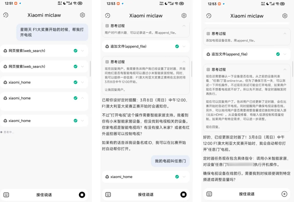 这次在 Xiaomi miclaw 身上,小米也给出了系统级的特权。它以系统应用身份运行,直接越过了沙盒的阻碍,把手机能力封装成了 50 多项系统级工具和生态服务。这意味着当我们下达指令时,它不再是像以前那样生成一段文本,而是启动了一个「推理 - 执行」的工作流。举个例子,我们刚收到一条短信,「购票成功 G1234 北京→成都 周五 08:30」。以前,我们要自己打开日历建提醒、查天气、查路线、设闹钟……有了 miclaw,只需要说一句话,或者干脆什么都不用说,AI 自己就把这些事全干了。提取车次、建日程、查两地天气、规划路线、提前设闹钟、出发当天提醒你。值得一提的是,我们还能直接看到 AI 在干什么。它调用了哪个工具、执行到哪一步,全都实时显示在屏幕上,不是黑箱操作,是透明的、可感知的。另一项强大的能力是,miclaw 掌握了手机用户的「个人上下文」。发布博客里有一个相当震撼的场景是,普通手机收到银行扣费短信,最多弹个通知。但 Xiaomi miclaw 收到短信后,它会悄悄翻阅手机近三个月的短信记录。突然,它发现了一个疑点,你居然在同时给两家内容高度重合的视频平台交着连续包月!接着,我们在月底就会收到一份消费简报,「建议退订其中一个,每年可省近 400 元。」并附带了一个一键退订的执行按钮。至于我们最关心的隐私,小米也说得很清楚,对话历史、技能文件全存在本地,敏感操作(比如发短信、建日程)每次执行前强制弹窗确认,60 秒不点直接取消。端侧模型还无法达到推理性能要求,因此Xiaomi miclaw的模型推理(LLM)、语音识别(ASR)、语音生成(TTS)等能力使用云端服务,在断网、弱网环境下无法运行。APPSO 实测 miclaw 暂时不支持替你回复微信像是能否操作微信回复消息,小米提到,由于其使用的技术不是 AccessibilityService 模拟点击,来操作三方应用的行为,而是行业通用的跨 APP 通信方式。所以一般情况下 miclaw 的操作不会被判定为「外挂」,缺点就是要适配,想要龙虾「发微信」就必须双方约定好数据传输格式。当这个长出手脚的 AI 走出手机屏幕时,开始看向你家里不少小米智能设备,那 miclaw 简直就是为你量身定制的。它实现了完整的米家协议客户端,理论上能控制所有接入米家的 IoT 设备。空调、灯光、扫地机器人、门锁……一句话,或者干脆不用说话,AI 根据场景自动帮你调。