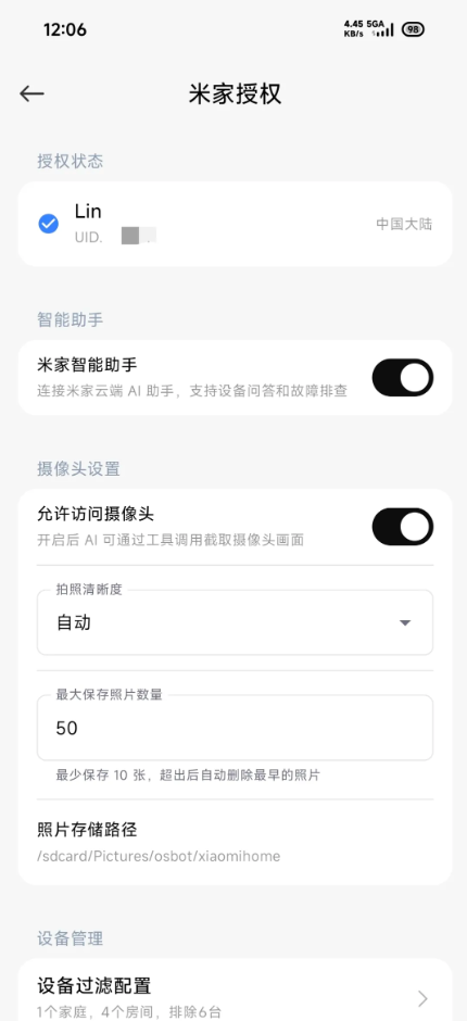 在 miclaw 设置内,我们可以选择是否让 miclaw 有访问摄像头的权限和是否连接米家云智能助手以前我们玩智能家居的流程是,在 App 里辛苦地设置条件:「如果时间到了晚上 10 点」且「如果有人经过传感器」,那么「打开廊灯」。这种基于僵硬规则的 IF-THEN 逻辑,本质上还是大型的程序员思维外包,别无他用。实测 miclaw 能调用米家生态设备,调用摄像头拍照现在,当我们的日历上写着「10:00 重要客户会议」。AI 看到后,不仅手机自动静音,扫地机器人立刻原地憋回去,甚至连来电都开始分级:老板的电话震动一下,快递员的电话直接静默拦截。