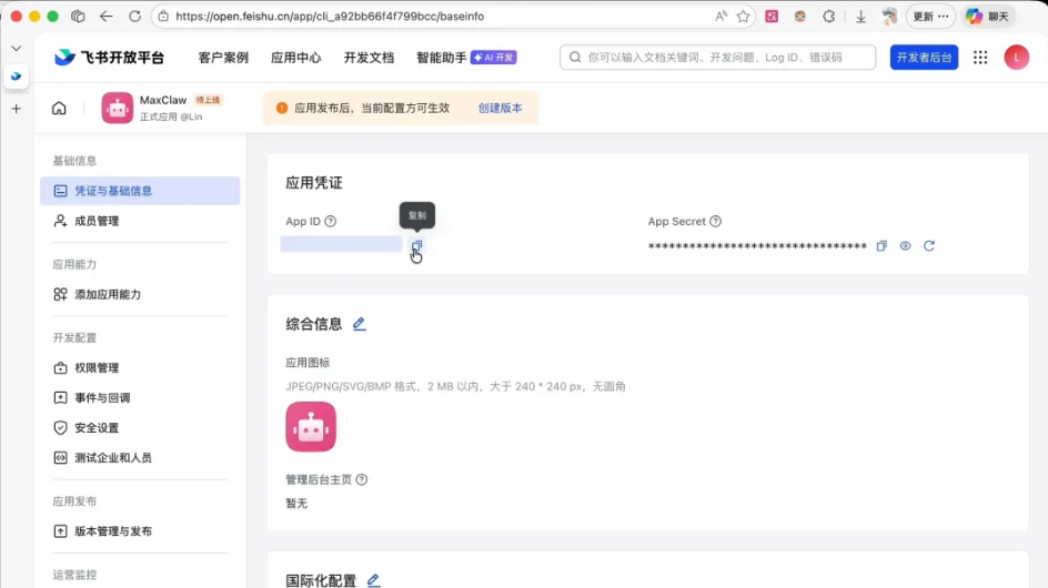 第一步: 在飞书开放平台创建应用(建议用个人账号或新建企业号,省去审批),把 AppID 和 Secret 复制发回给 Claw。