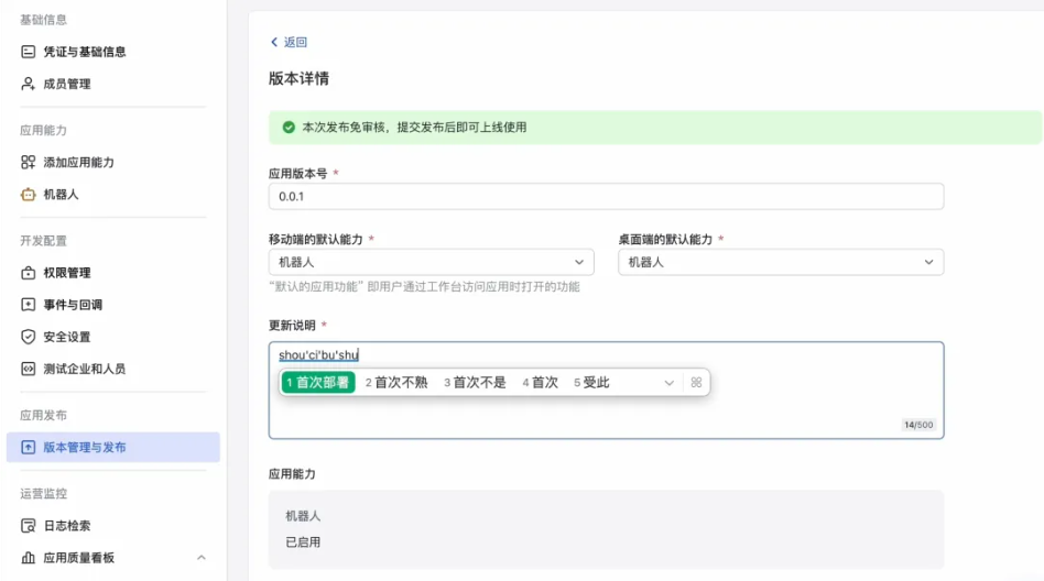 第三步: 进入事件配置,把订阅方式改成「长连接」,勾选接收消息。接着去版本管理里随便填个版本号(比如 0.0.1)和更新日志,点保存发布。