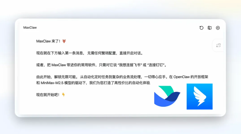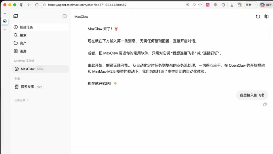 打开 MiniMax Agent 官网,点击侧边栏的「MaxClaw」,直接对它说 “我想接入到飞书”,它就会给你发步骤指引。跟着做就行: