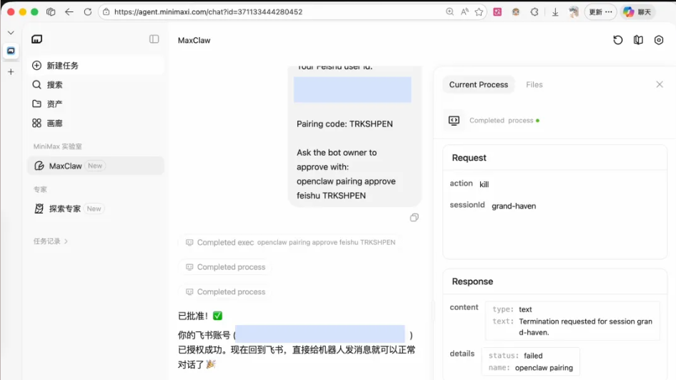 最后,在飞书里给机器人发个消息,它会返回一串匹配码,把这串代码发回给网页端的 MaxClaw。