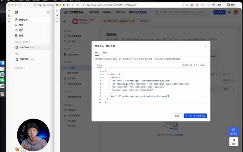 第二步: 在飞书的权限管理页点击「批量导入」,把 MaxClaw 发来的代码整个替换进去。系统会提示你开启机器人能力,点确认。