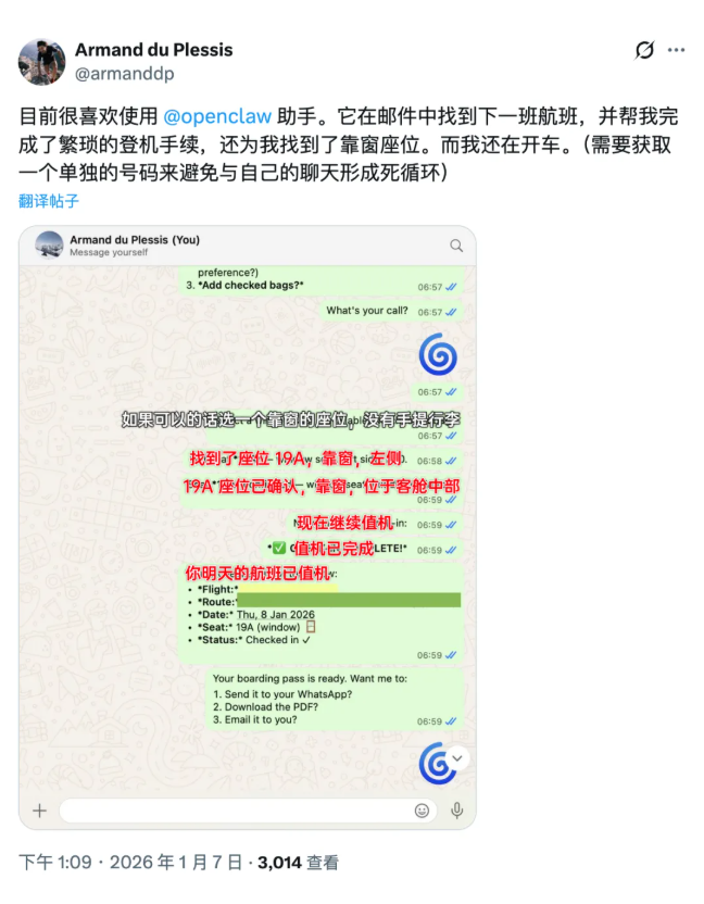 在电脑上部署之后,小龙虾能直接接管你的键盘鼠标和文件。你只要在聊天软件里给它下需求,它就能自己动手干活。甚至有网友直接让它去邮件里找航班信息,顺手把选座值机也办了,一波操作看愣了不少人。