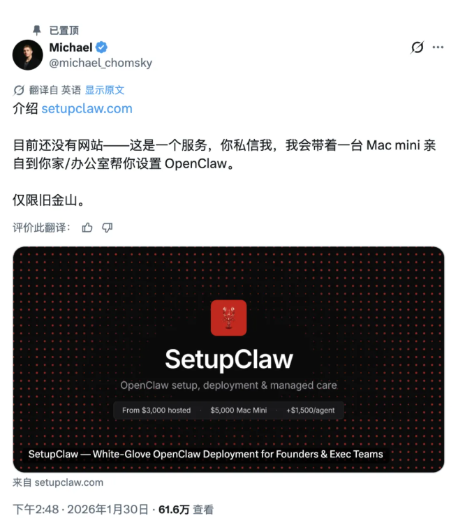 海外代装平台 SetupClaw 已经给出明码标价:托管安装,3000 美元;含 Mac mini 硬件的远程配置,5000 美元;含 Mac mini 硬件的现场配置,6000 美元。