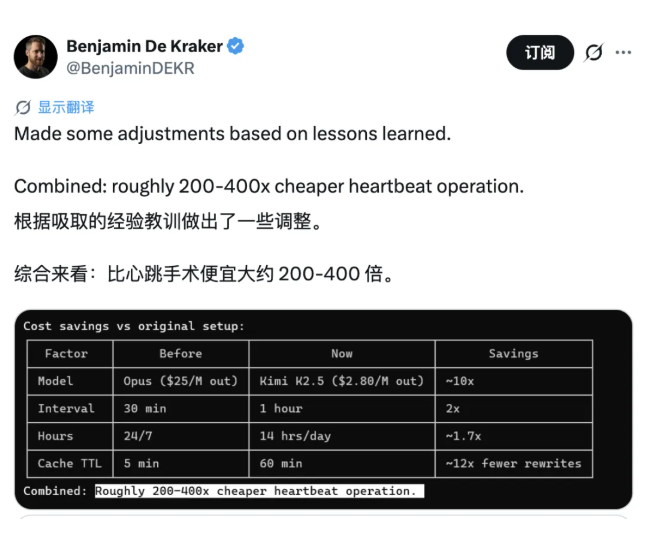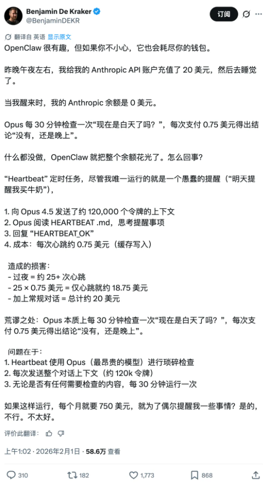 有开发者复盘后发现,系统在没有太多实际产出的状态下,仅靠心跳机制维持每天就消耗 20 美元,一个月白白烧掉近 750 美元。