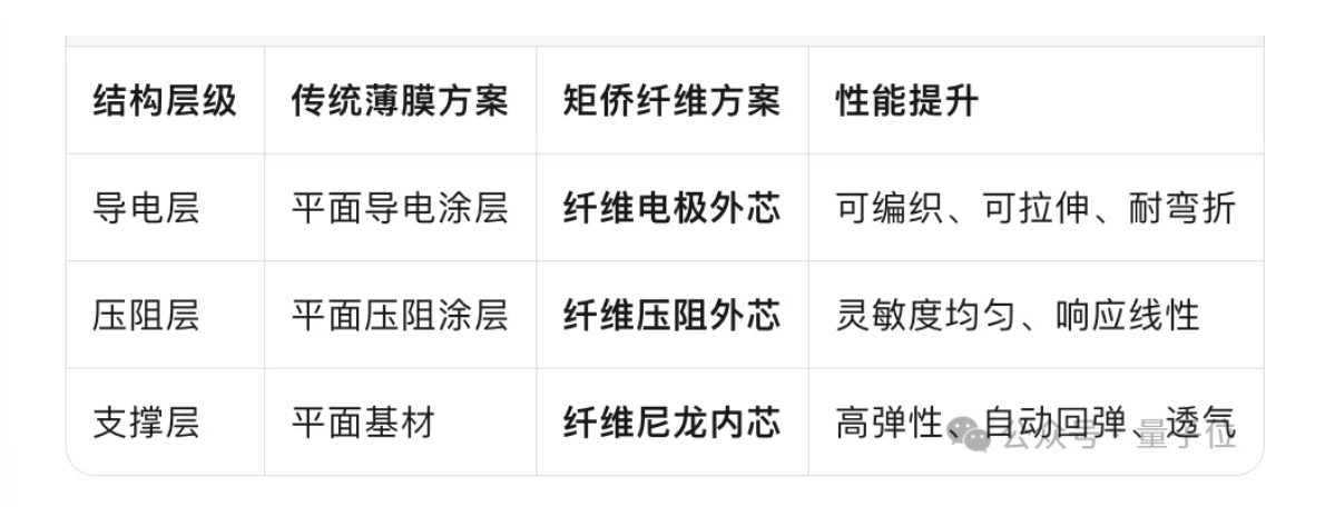 而矩侨的创新方案将三层结构完全解构为纤维化形态:纤维尼龙内芯+纤维压阻外芯+纤维电极外芯。