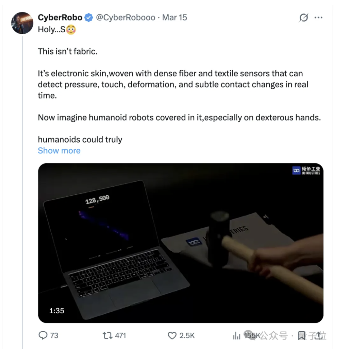 如果把它穿在人形机器人身上,尤其是套在灵巧手上,那么机器人就真正能够感知和触摸世界。