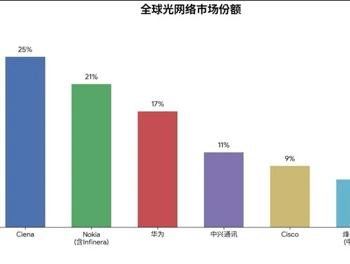 全球光网络市场份额(2025年):根据 Dell'Oro Group 及行业统计数据,诺基亚以21% 的市场份额位居全球第二,仅次于华为(26%),超越 Ciena(19%)等传统巨头。