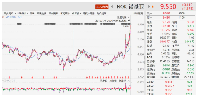诺基亚凭借完整的光通信产业链,精准踩中这一时代风口。2026年4月9日,诺基亚美股股价创下自2010年4月以来的16年新高,市值逼近550亿美元,年内涨幅超48%。高盛、摩根士丹利等顶级投行纷纷上调其评级,将诺基亚列为AI基础设施领域首选标的。