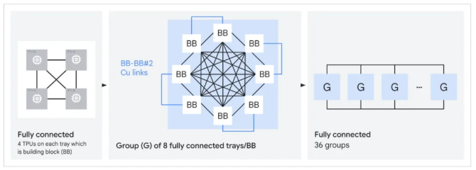 与此同时,谷歌还为 TPU 8i 设计了一种名为 Boardfly 的全新网络连接方式。传统的 3D Torus 网络在连接大量芯片时,数据包在芯片之间传输时需要经过很多跳。Boardfly 通过借鉴 Dragonfly 拓扑的思想,利用增加长距离直连链路的方式,把由 1024 颗芯片组成的系统里的最远的两个芯片之间的通信距离从 16 跳减少至 7 跳,降低了 56%,让任何两颗芯片之间都能更快地交换信息,助力更好地处理复杂的推理任务。
